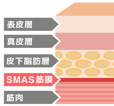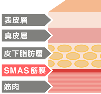 ハイフは他のたるみ治療では届かない皮膚の深い層にあるSMAS筋膜にもアプローチできます。