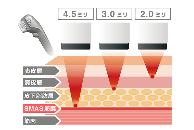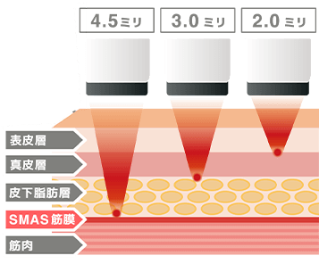これまで表皮から4.5mmの深さにあるSMAS筋膜はメスによる手術でしか治療できなかったため、ハイフは革新的な治療方法だと言えます。