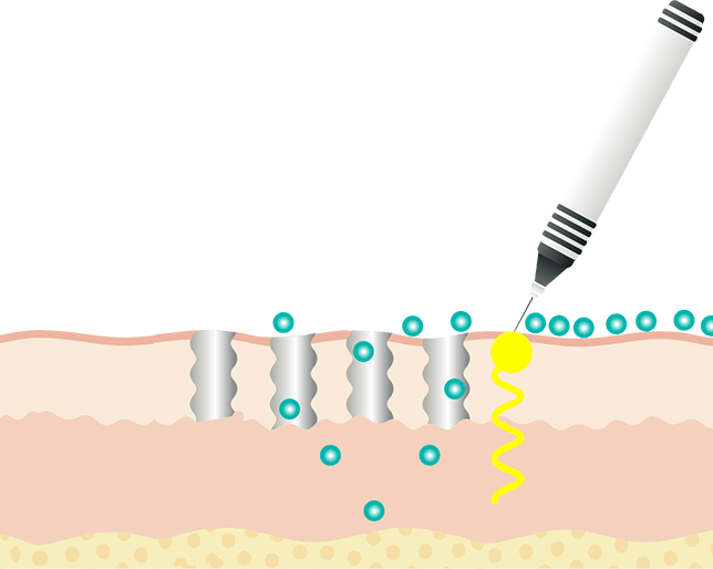 ペン型のプローブで特殊な電気パルスをお肌にあてる事により、親水性の小孔を生じさせるエレクトロポレーション法